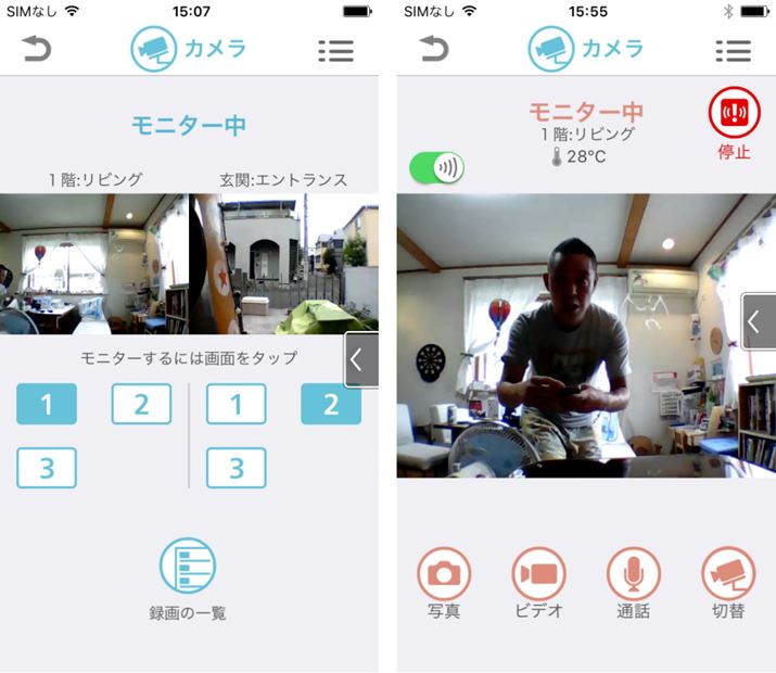 屋内カメラのモニター画面にはカメラ映像と音声に室内温度も表示。コマ落ちはしますが、同時に2つのカメラをモニター可能
