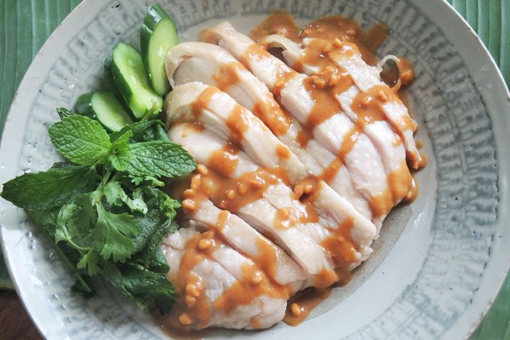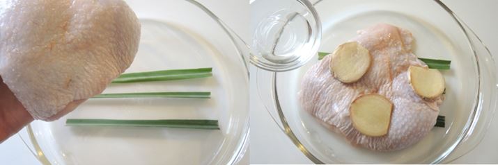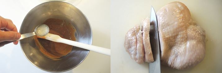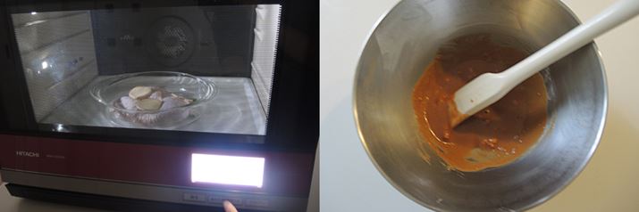 (9)蒸し鶏ができあがったらレンジから取り出し、鶏の下にたまった蒸し汁を小さじ1、ソースに加えましょう。