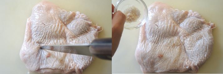 (1)鶏肉は余分な脂肪があれば取り除き、皮目に包丁の先を刺して、いくつか穴を空けておきます。