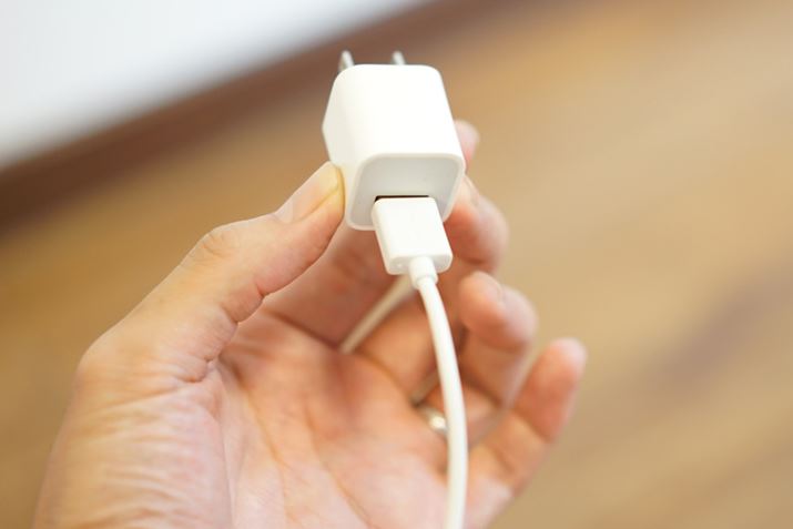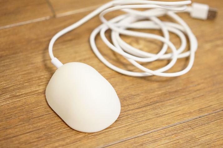 USBケーブルの長さは185cmです。このコネクターの形状、どことなくアップル製品のものに似ているような……(笑)。今回は、iPhoneの電源アダプターにつなげて使ってみることにしました