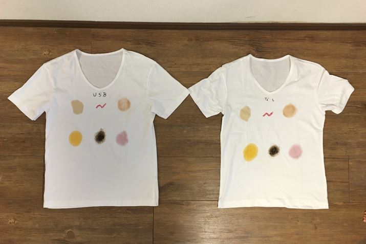 それでは、「どこでもUSB洗濯機 ウォッシュブル」の実力を検証していきましょう。同じように汚れをつけたTシャツを用意し、「どこでもUSB洗濯機 ウォッシュブル」を使ったものと、「洗剤のみでつけ置き」をしたもので比べてみました。汚れ落ちにはどれほど差が出るのでしょうか?