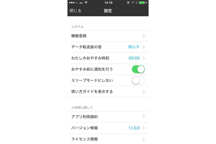 「就寝時間」や「起床時間」といった本体の設定は、「ねむり時間計」アプリで行なう。なお、スマートフォンとの通信にはBluetoothを使用する