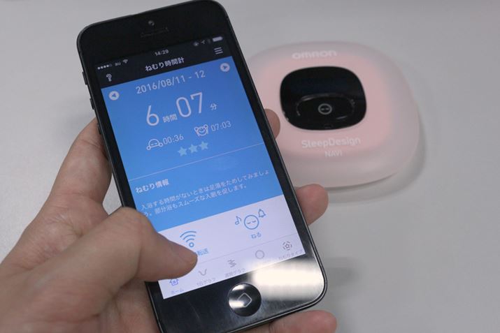 朝、起床したらデータの転送を行う。アプリを立ち上げて「データ転送」をタップし、本体裏の「SET」ボタンを押すだけ。「今日の眠りはどうだったかな」?と、起床時のちょっとした楽しみにもなる。ちなみに、データの転送は起床直後でなくてもOK