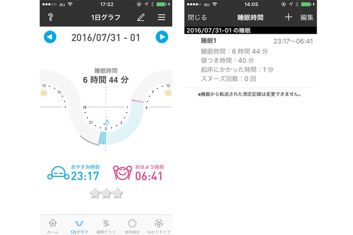 日別のデータ。「昨夜の睡眠時間」や「寝つきにかかった時間」、「起床にかかった時間」を24時間の流れで確認することができる