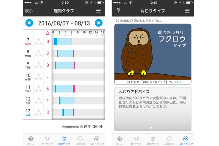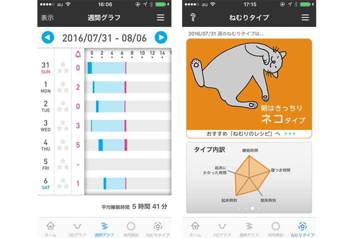 引き続き、「ねむり時間計」を2週間ほど使用してみた。アプリでは、日曜日〜土曜日の1週間分のデータから、「睡眠時間」「寝つき時間」「就床時間」「起床時間」「起床にかかった時間」の5つで評価。眠りの特徴を、睡眠不足のキリン、夜行性のモモンガ、朝寝坊のライオン、パーフェクトなヒツジなど9種類の動物にたとえて判定してくれる。それぞれの特徴に合わせてアドバイスしてくれるだけでなく、日、週、月それぞれのデータで表示できるので、眠りの特徴や変化を把握できるのだ。