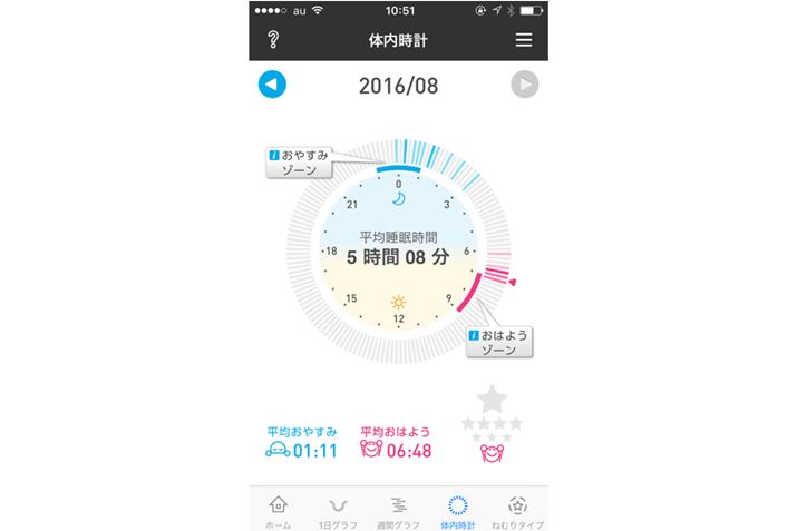 空欄になっているのは、うっかり「ねむり時間計」のセットを忘れてしまった日。ただし、日曜日から土曜日の間に2日以上分の睡眠データがあれば「ねむりタイプ」の判定はしてくれるので、あまり神経質になる必要はない