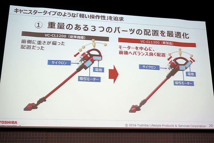左側が旧モデル、右側が新モデル「VC-CL1300」。デザイン性を重視していた旧モデルでは、グリップより前方に「サイクロン」と「吸引モーター」を配置していたため、前側に重さがかたよってしまっていた。新モデルでは、「吸引モーター」を中心に、「サイクロン」「電池」を前後にバランスよく配置したことで、持ち上げやすくなった