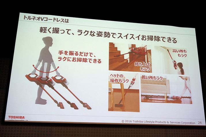 強い吸引力と軽い操作性の両立を追及している東芝の「トルネオV コードレス」シリーズから、新モデル「VC-CL1300」が発表された。重さは旧モデル「VC-CL1200」の1.9kgから変えずに、グリップ形状の変更や、モーターなど重みのあるパーツの配置を改良することで、より動かしやすく、また、持ち上げ時にも重さを感じにくくなったという。2016年8月2日に行われたセミナーの様子と実際の使用感をあわせてお伝えしよう。