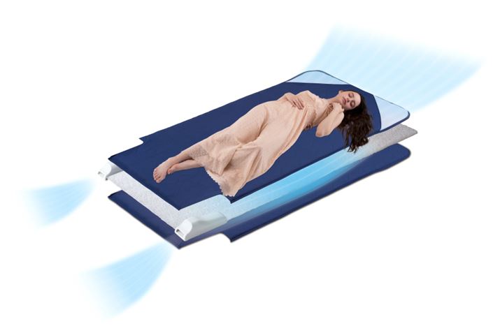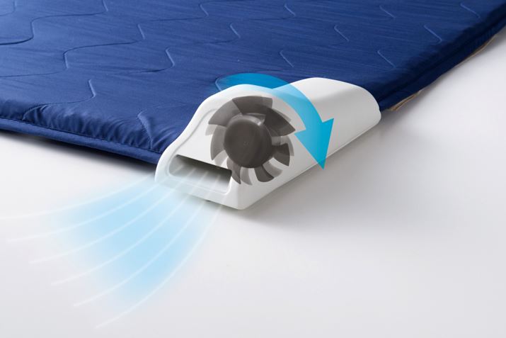 まずはその仕組みをチェックしておきましょう。マットに2基のファンを搭載し、マット内の空気を強制換気できるというちょっとユニークなこの製品。マットの上部がメッシュ素材になっており、ファンを稼動させることでそこから空気を吸い込み、マット下部の吹き出し口から内部の空気を出すことができるようになっています。マット内部の空気を換気することで、熱と湿気を逃すという仕組みです。