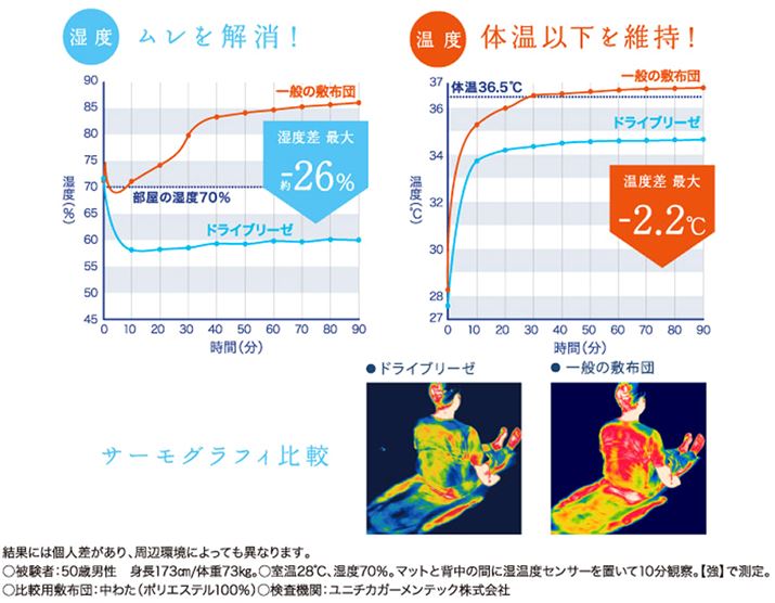 ちなみに、ドライブリーゼを利用することで実際に湿度や体温の上昇を抑えることができたという実験結果が、同社のサイトに掲載されています