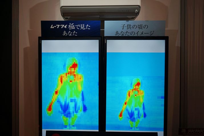 手足の先の温度変化まで0.1℃単位で検知する「ムーブアイ極」で、筆者の体温も瞬時にサーチされた。ちなみに、右側の画面「子供の頃のあなたのイメージ」は、単純に左側の画面を縮小したものなので気にしないでほしい