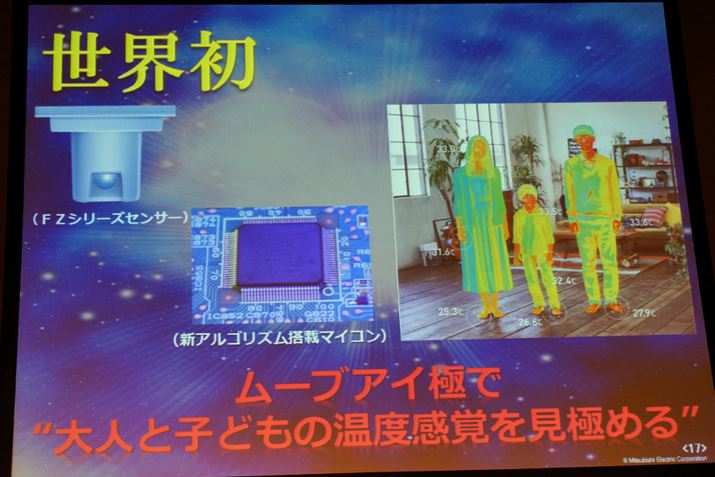 人それぞれ快適と感じる温度は異なるものだが、とくに体温調整機能が未発達な子どもと大人とでは体感温度に最大3℃ほど差が出るという。つまり、大人には快適な室温だとしても、子どもには暑い環境だったりするのだ。そこで、まずは大人と子どもを判別できるように新たな機構を開発。赤外線センサーで身体の末端部分の細部まで温度変化を感知する「ムーブアイ極」と、独自のアルゴリズムで解析するマイコンを組み合わせることで子どもを識別できるようにした。