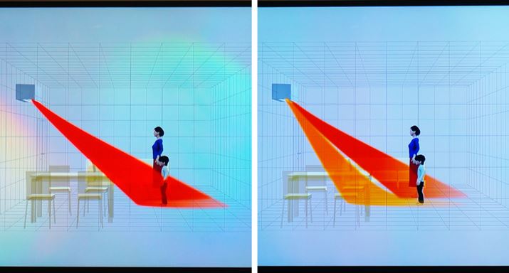 ちなみに、男性の居た位置に子どもがくると送風具合が変わる(下の動画参照)。子どもであると識別したあと、いったん風量が抑えられ、男性の時よりも少し手前側に送風ポイントが移動。これは、大人よりも身長が低い子どもの足元を暖めるための気流制御だ。