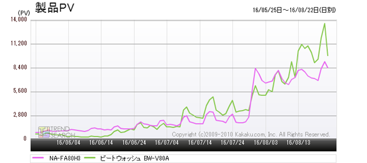 そんなパナソニックと日立から、ほぼ同時期にあたる6月中旬、縦型洗濯機の最新モデルが相次いで発売され、すでに2か月ほどが経過した。なかでも主力モデルである洗濯容量8kgのパナソニック「NA-FA80H3」と、日立「ビートウォッシュ BW-V80A」の争いが熾烈になってきている。2016年8月24日時点では、日立「ビートウォッシュ BW-V80A」が売れ筋ランキングで1位、パナソニック「NA-FA80H3」が6位と、その人気にやや差が付いているが、「価格.comトレンドサーチ」のデータを見ると、面白いことがわかってくる。