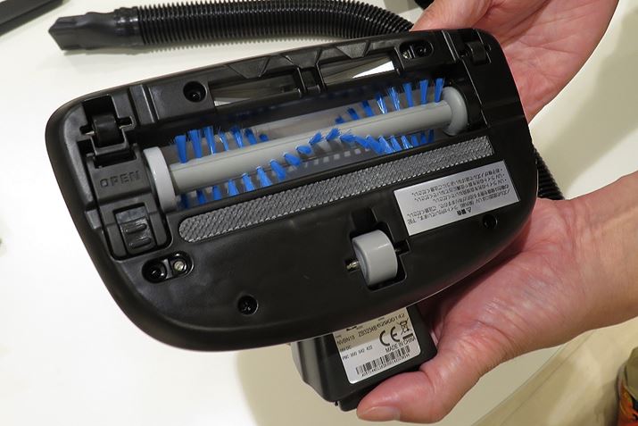 布団用ノズルの裏側。ロールブラシを搭載。前方には除菌用UVライトも搭載する。布団を叩く機能や温風機能は搭載されていない