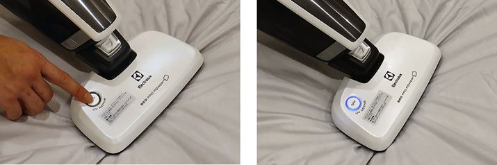 UVライトはノズル上部のボタンでオン/オフできるほか、光を直視しないよう、安全のため設置面(布団)から5.5cm以上離れると消えるようになっている