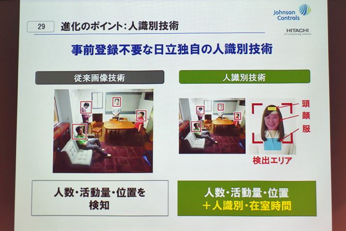 人識別の方法は、まず「画像カメラ」が頭と肩を見つけて人を判別。その後、頭と顔、服の色情報や柄、環境変化などの情報を加味して個人を見分ける。部屋全体を150°の角度で検知し、7m先まで識別可能