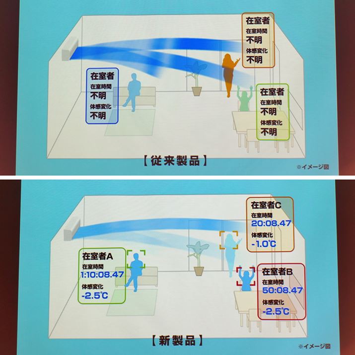 人識別技術が搭載されたことにより、在室時間が長い人は「体が冷えている」と判断。直接風が当たらないように送風がコントロールされる
