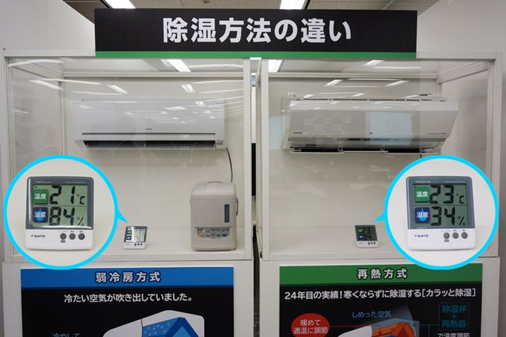 再熱方式と弱冷房方式で同じような室温になったところで湿度を見てみたところ、弱冷房方式のほうは50%も高い湿度となった。再熱方式の部屋は、温度を下げ過ぎずにしっかり除湿できることがわかる
