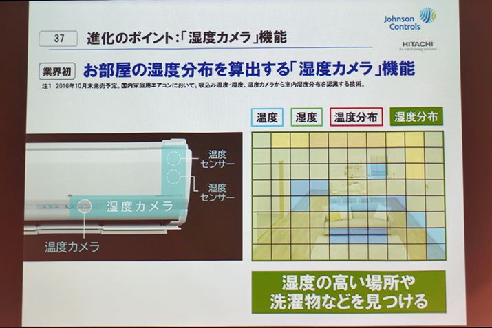 あまり冷房が好きでない人にうってつけな除湿運転も、性能がアップした。日立のエアコンは、従来から「再熱方式」の除湿を採用している。部屋の空気を取り込み、冷やして湿気を除去。その後、温度が下がり過ぎた空気を暖めて部屋に戻すといった仕組みだ。湿度のみをコントールする「弱冷房方式」の除湿よりも電気代はかかるが、「冷たい空気が吹き出して寒い!」といった事態を防げるのは魅力。そんな除湿運転で、「温度カメラ」に温度センサーと湿度センサーを組み合わせた「湿度カメラ」機能をONにすると室内の湿度分布が検知できるようになる。この機能を利用すれば、湿度が高い所を重点的に除湿。洗濯物を室内に干した場合、ランドリー除湿の効果が発揮される。
