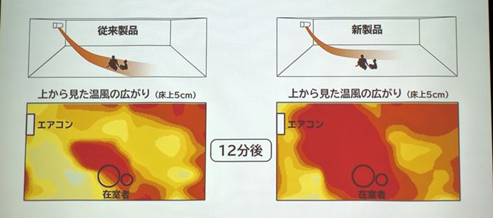 暖房運転では人の足元に向けて暖気を送風することが多いが、それでは部屋全体はなかなか暖まらない。新モデルでは、人が暖まったと判断すると送風方向を変えていく。そうすることにより、“人も部屋も素早く暖かい”を実現
