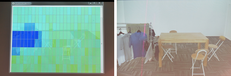 「くらしカメラAI」では右の部屋が左のように見えており、湿度の高い洗濯物のあるところに風を送る