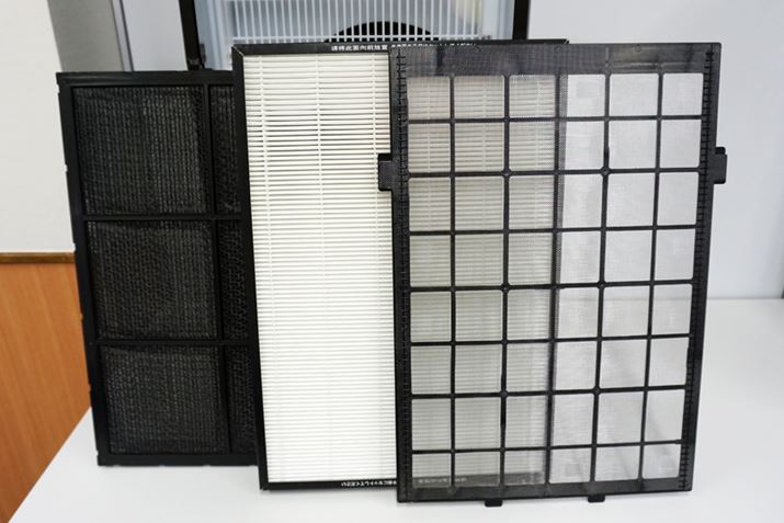 プレフィルター→HEPAフィルター→脱臭フィルターを通過して、空気は清浄されます。0.1〜2.5μmの粒子は99%捕集できるようになっているので、PM2.5への対応もバッチリ