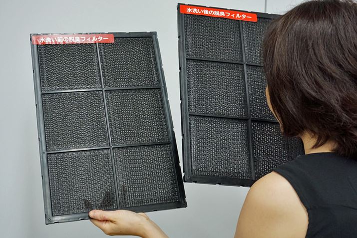 脱臭フィルターは水洗いすると付着したニオイ成分が溶け出し、脱臭力が復活するそう。タバコのニオイが付いた脱臭フィルターを洗ったものを臭いでみましたが、無臭でした