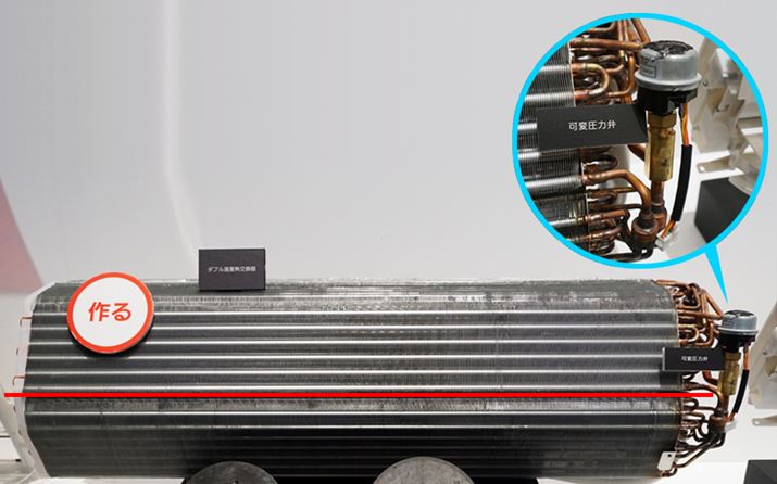 暖房時に可変圧力弁がONになると、熱交換器の上の部分(赤い線より上)が高温度となり、下の部分は中温度となります。もちろん、熱交換器の温度を同一にして吹き分けしない運転も可能