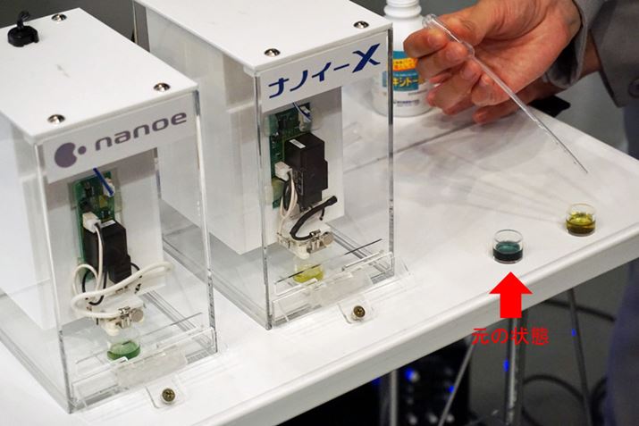 除菌効果があると色が変わる試薬を用いて、ナノイーとナノイーXの除菌スピードの差を比較。一番右側は消毒液を垂らしたものですが、色が黄色っぽくなっています。それに近い状態にナノイーXも変色。ナノイーも青色が薄くなっているので時間をかければナノイーX同様の除菌効果を発揮しますが、除菌スピードはナノイーXのほうが早いことがわかりますね