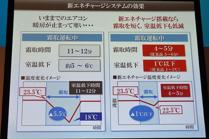 前モデルではWXシリーズにしかなかった「エネチャージシステム」が、本モデルからXシリーズにも搭載されました。エネチャージシステムとは、冬場、霜取り運転が始まると暖房がストップしてしまい室温が低下するのを防ぐための機構。暖房運転中に大気中に捨てられていた熱をチャージしておき、その熱を霜取り運転に利用することで暖房運転が停止しなくて済むというものです。従来よりも蓄熱効率が向上しており、霜取り運転時間の短縮や室温低下がさらに低減したそう。