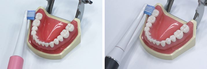 歯列に対して平行にブラシを入れた場合、まっすぐなヘッドでは奥歯とブラシの間に隙間ができるが(左)、「HT-B315」の場合はブラシが歯に密着している(右)