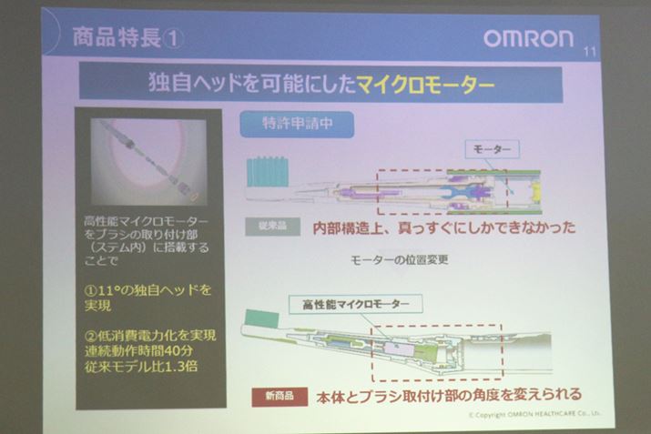このように、「HT-B315」のヘッドを傾けることができるようになった理由は、内蔵されているモーターの進化にある。従来機に使用していたものよりもコンパクトになった高性能マイクロモーターによって、従来機までは本体に内蔵するしかなかったモーターを、ブラシの取り付け部分に内蔵できるようになった。これにより、ヘッドを傾けたデザインが実現したのだという。