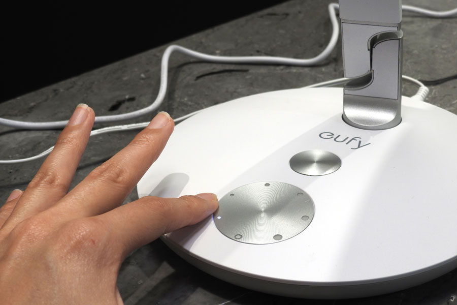 続いての製品はLEDデスクライトの「Eufy Lumos E1」と「Eufy Lumos A4」。共通の特徴は、6段階の調光および、5段階のカラー調整により、合計30通りの好みの「光」を作れる点。また、従来より75%エネルギー消費が少ないLEDライトを採用したことで、約50,000時間の長時間寿命を実現。一般的なLEDライトは約40,000時間の寿命と言われているため、比較すると25%効率化していることになる。なお、ハイエンドモデル「E1」には、ユニークな機能としてUSB充電機能を搭載し、スマートフォンなどの端末を充電できる。