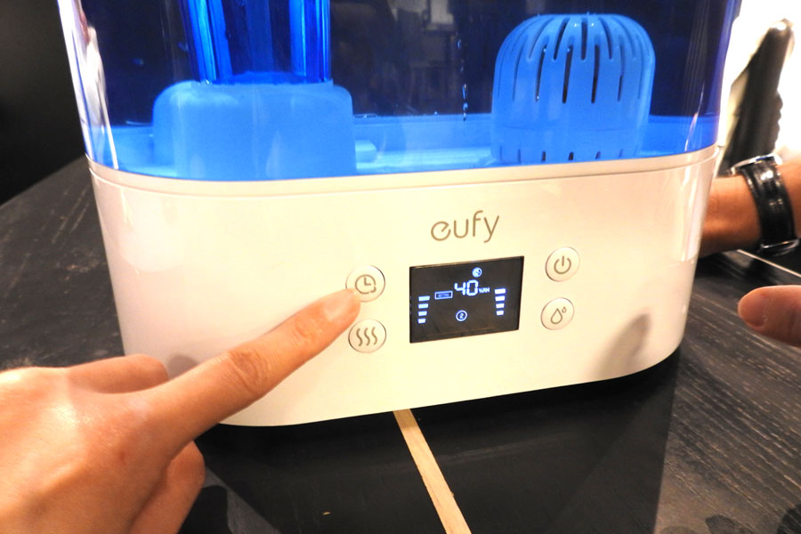 最後に紹介する製品は、4Lの水タンクを搭載した超音波加湿器「Eufy Humos Air」だ。特徴は、高感度なセンサーを搭載し、周囲の湿度レベルを感知して加湿する点。加湿器本体前面に搭載したパネルで、設定した湿度に満たない場合のみ加湿できるため、過剰に加湿する心配がない。湿度調整は3段階のミストレベルで調整できる。また、ミストを出すノズルは360°回転し、好みの方向に調整可能だ。