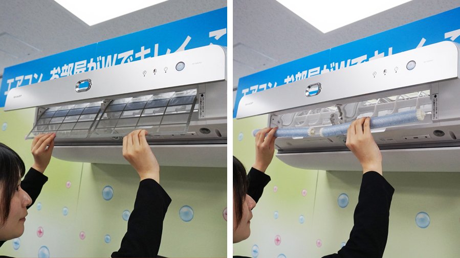 エアコンの快適さは空調コントロールの的確さに左右されるところが大きいですが、部屋の空気を制御するものだけにキレイは気になるポイントです。シャープのエアコンは従来からプラズマクラスターイオンでエアコン内部のカビ対策をしていましたが、Xシリーズでは部屋のカビのケアまで範囲を拡大。さらに、ダストボックスやルーバー、掃除ブラシなど多くのパーツを取り外して水洗いできるようになりました。“エアコンにおまかせ+自分でもお手入れ”でキレイを徹底! まずは、取り外しが簡単な様子をご覧ください。