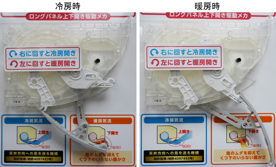 冷房時はパネルがすくい上げるような向きとなり、天井を沿って冷気を送風。いっぽう、暖房時は上昇しやすい暖気を押さえ込むような状態にすることで足もとに暖気を届けます