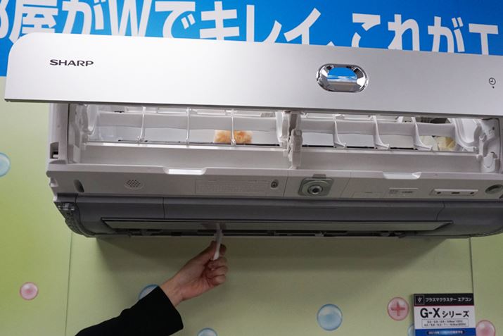 エアコンの快適さは空調コントロールの的確さに左右されるところが大きいですが、部屋の空気を制御するものだけにキレイは気になるポイントです。シャープのエアコンは従来からプラズマクラスターイオンでエアコン内部のカビ対策をしていましたが、Xシリーズでは部屋のカビのケアまで範囲を拡大。さらに、ダストボックスやルーバー、掃除ブラシなど多くのパーツを取り外して水洗いできるようになりました。“エアコンにおまかせ+自分でもお手入れ”でキレイを徹底! まずは、取り外しが簡単な様子をご覧ください。