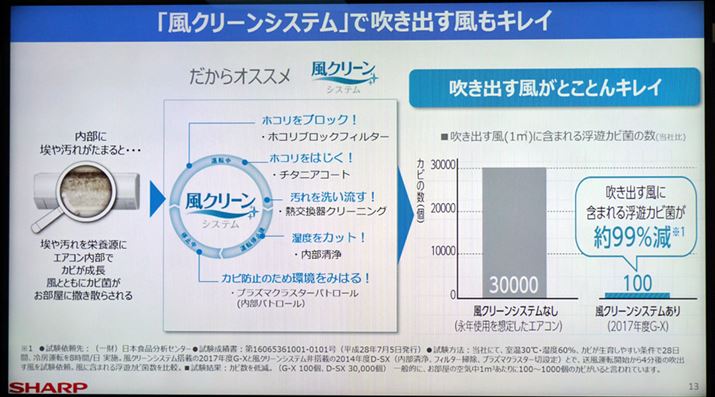 このほか、フィルターの網目を小さくしてエアコン内部へのホコリの侵入を防いだり、熱交換器の汚れを洗い流すなどのクリーンなシステムを搭載。このシステムがあることで、エアコンから放出される風に含まれるカビ菌は約99%も減ったそう