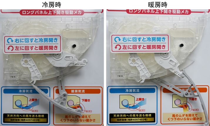 冷房時はパネルがすくい上げるような向きとなり、天井を沿って冷気を送風。いっぽう、暖房時は上昇しやすい暖気を押さえ込むような状態にすることで足もとに暖気を届けます
