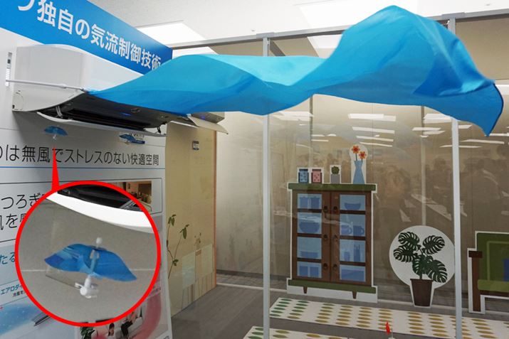 一般的にパネルの可動部から風が漏れることが多いのですが、シャープのエアコンは空気が漏れない工夫が施されています。エアコン直下に装着された風車は動いていませんが、冷気は遠くまで送風されていることがわかりますね