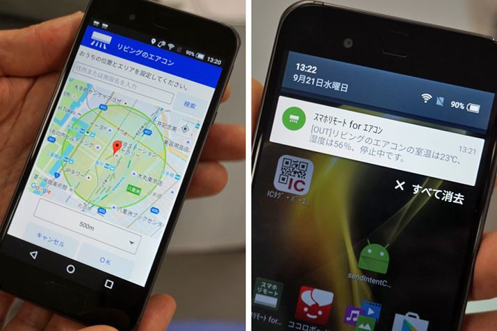 スマートフォンと連携したエアコンは、一般的に自分でアプリを起動して現在の状況を確かめねばなりませんでした。Xシリーズは、自宅から設定してある距離離れると、自動でエアコンの運転状況と室温がメッセージで届きます。また、帰宅時に設定距離まで近づいたタイミングで現在の室温などを教えてくれるので、帰路の途中でエアコンをONにすべきかが判断できるのも魅力