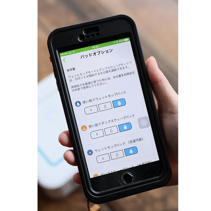 さらに、「ブラーバジェット240」ならではの特徴として、スマホアプリ「iRobot HOME」に対応。「iRobot HOME」はスマホからルンバ(ルンバ900シリーズ)を操作できるアプリで、これをダウンロードすれば、自宅のWi-Fi(Bluetooth)を経由してスマホと接続。このアプリを使えば、掃除のスタートやストップ、設定の変更などができる。例えば、念入りに水拭きをするウェットモップモードは、床の材質によってはやや水が多すぎるという場合がある。そんなときにスマホを使って水の量を調整することができる。
