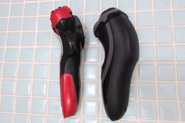 写真左の愛用している往復式シェーバー(3枚刃)と比べてみるとかなり大きく見えるが、重心が下のほうにあるためか、思ったより重くない