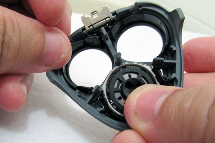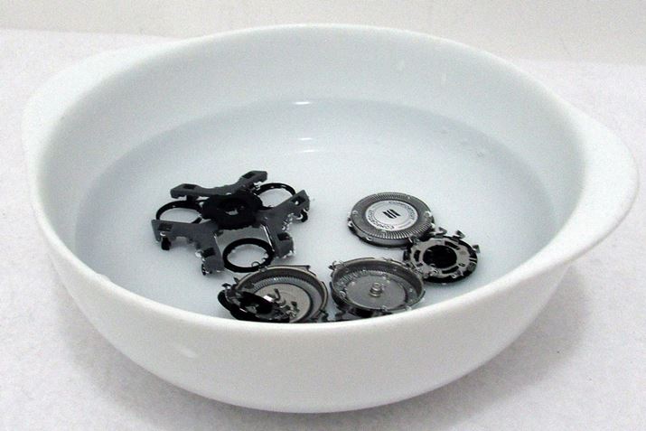 シェービングユニットの3つの刃をさらに外刃と内刃に分解して、皮脂汚れなどを落とすために40℃のお湯に浸ける