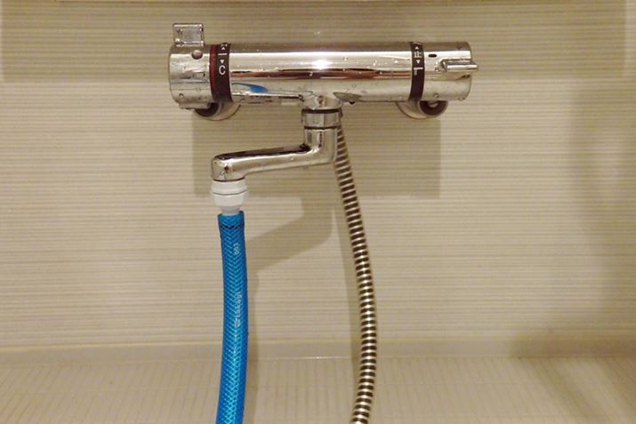 次は給水できるように、別途購入したホースを水道の蛇口に取り付けます。ホースは全自動式洗濯機のものではなく、水撒き用や園芸用の普通のタイプを用意してください。なお、蛇口に固定するためのアタッチメントが必要な場合もあり