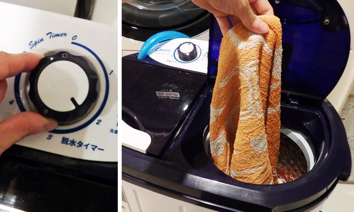 脱水槽の左右に衣類が偏って入っていると、うまく遠心力が働かず上手に脱水できないことも。なるべく、左右均等になるように入れましょう。また、脱水中の振動もわりと大きめなので、使用する場所や時間帯は問われるかもしれません。脱水後の衣類は絡みもなく、比較的するりと取り出せました