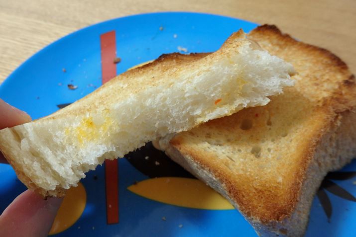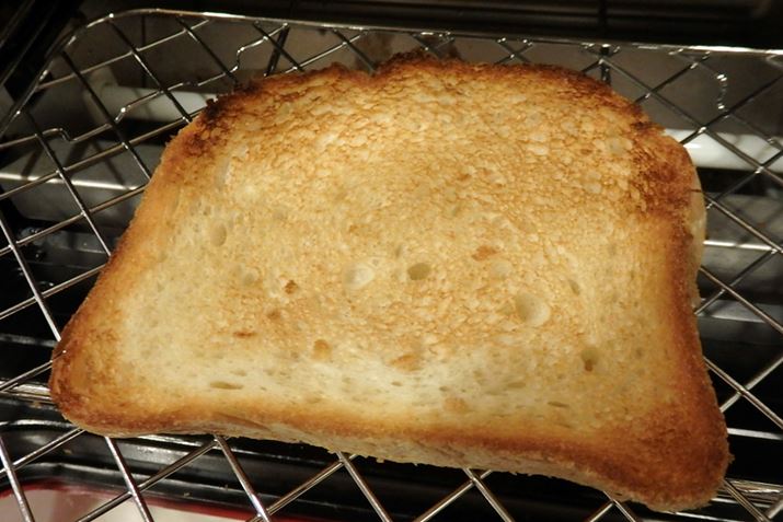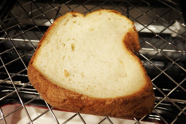 筆者がホームベーカリーで作った小さめの食パンを加熱時間3分で焼いてみたところ、ちょっと縁が焦げてしまいました。一般的な食パンの1/2程度のサイズだったからかもしれませんが、このぐらい焼けているのが個人的には結構好み