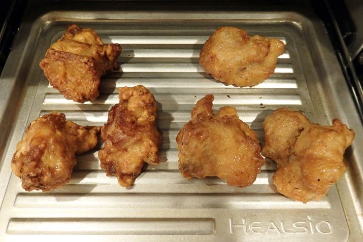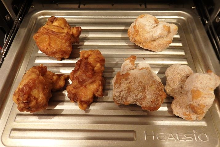 常温からあげは熱々になりましたが、冷凍のほうはあたたかいけれど熱々ではない状態。温度帯が違い過ぎるものは、少し仕上がりに差が出るようですね。とはいえ、同じ温度帯のものは均一にあたためできていたので大満足です