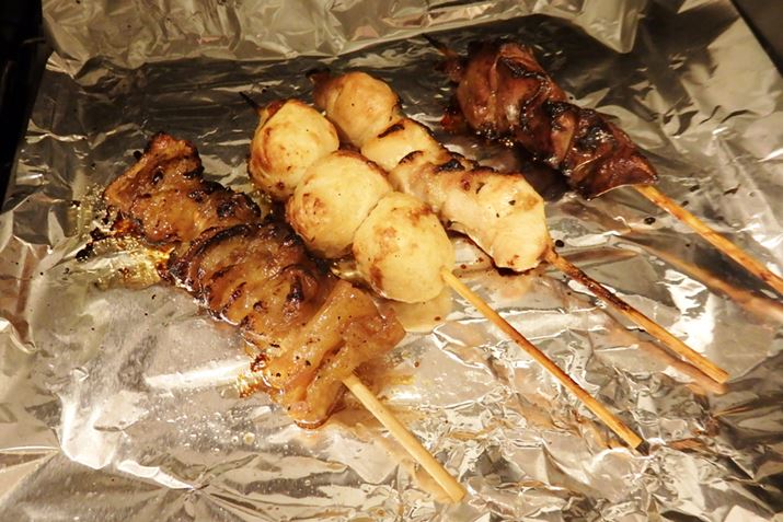 いろいろな部位の焼き鳥も一度にあたためてみます。串に刺したままですが、大丈夫でしょうか。ちなみに、油が多く出るものはトレイにアルミホイルを敷くと片付けがラクになるのでおすすめです!